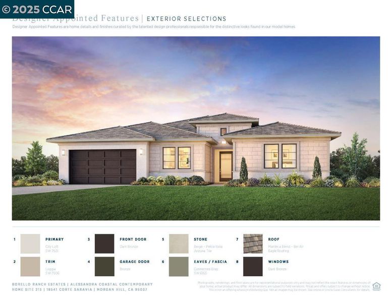 Set in a secluded location surrounded by Morgan Hill's soft rolling hills and open space, Borello Ranch Estates is a luxury gated community. Located at the southern tip of the Silicon Valley in Morgan Hill, an abundance of parks, golf courses, walking/biking trails, recreation centers and easy access to freeway and public transportations. An expansive great room is at the heart of this home. The home’s welcoming foyer opens onto the expansive great room with coffered ceiling, and multi-slide stacked door leads to desirable luxury outdoor living space beyond. Gourmet kitchen is open to a sizable casual dining area and features a large center island with breakfast bar, wraparound counter, white shaker style modern cabinets, and upgraded JennAir stainless steel appliances. Secluded primary bedroom suite are a generous walk-in closet and gorgeous primary bath with dual vanities, large soaking tub, luxe shower, linen storage, and private water closet. Secondary bedrooms feature roomy closets and private baths. Additional highlight include a large flex room with double French doors. Enjoy the 7,000+sqft resort-style recreation center with impressive pool, spa, barbecue facilities, bocce ball/pickleball courts and many other amenities (Photo not of actual home/yard for marketing only)