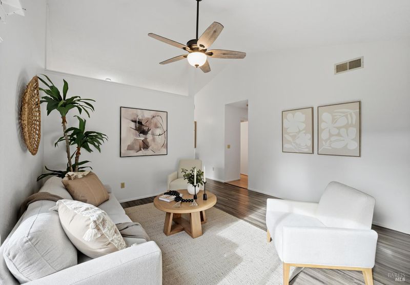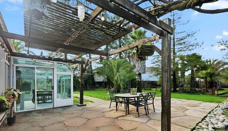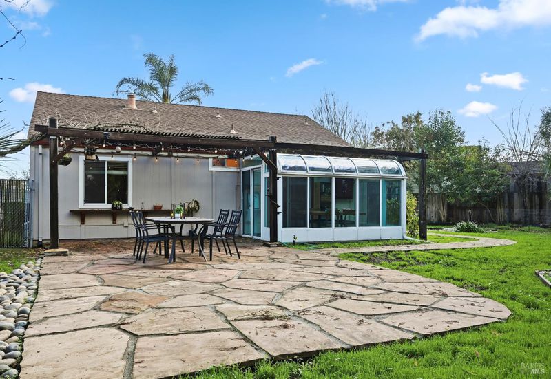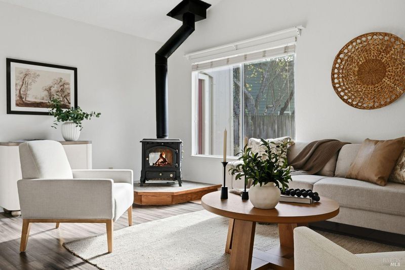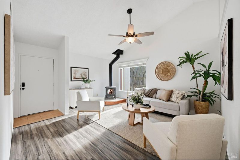 Welcome to this charming single-story home, tucked away in East Petaluma on a quiet cul-de-sac, offering privacy and a true sense of retreat. Situated on a spacious, park-like lot, the property features a stone patio with arbor, mature fruit trees, established gardens, recreational areas, and a serene outdoor setting, all perfect for relaxing or entertaining. Inside, the home offers 3 bedrooms and 1 bathroom, all on one convenient level. The cozy living room showcases vaulted ceilings, abundant natural light, and a wood-burning stove that adds warmth and character, creating the hub of the home, ideal for entertaining or quiet relaxation. The inviting atrium provides seamless indoor-outdoor living, allowing you to enjoy natural light and your private, park-like setting year-round. The kitchen features dedicated eating areas, perfect for preparing holiday meals, while outdoor entertaining shines with a covered stone patio, ideal for BBQs and chef-inspired masterpieces. Functionality and comfort continue with a two-car garage offering ample parking and storage. This special home blends comfort, privacy, and timeless charm in a highly desirable location and setting.