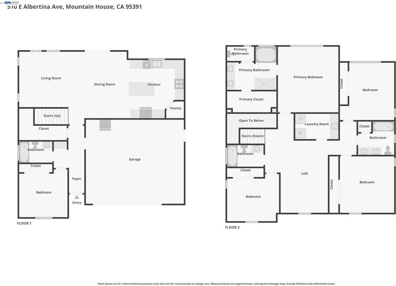 Welcome to this spectacular North-facing home in Mountain House, offering 5 bedrooms and 4 full bathrooms designed for both comfort and style. Step into a bright and open floor plan filled with abundant natural light and hardwood floors on the first level. The spacious layout includes a downstairs bedroom and full bathroom, perfect for guests, in-laws, or extended family. The expansive kitchen and family great room create the heart of the home—an inviting space ideal for gathering, relaxing, and entertaining. The gourmet kitchen shines with quartz counters, generous cabinet and counter space, a pantry, pendant lighting and more-making everyday living and hosting effortless. Upstairs, the primary suite is both spacious and elegant, paired with a luxurious primary bathroom designed for comfort and relaxation. A versatile loft area provides additional living space, perfect for a second family room, home office, or media area. The backyard is built for entertaining, featuring stamped concrete, low-maintenance landscaping, and space for gardening or creating your own outdoor retreat. Conveniently located near top-rated schools with excellent commuter access, this exceptional opportunity truly has it all. Welcome Home.