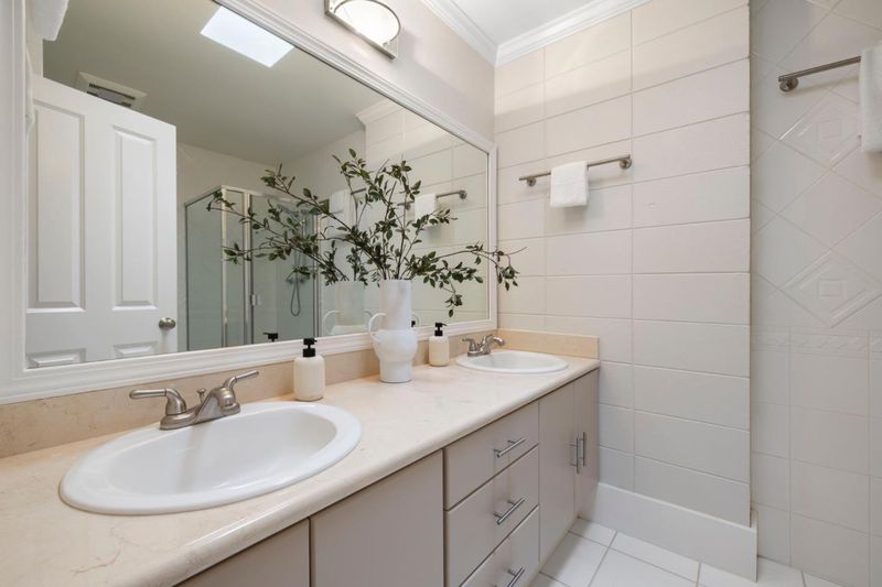 - Double Sinks, Dual Flush Toilet, Half on Ground Floor, Primary - Oversized Tub, Primary - Stall Shower(s), Solid Surface, Stall Shower - 2+, Tile, Tub in Primary Bedroom, Updated Bath