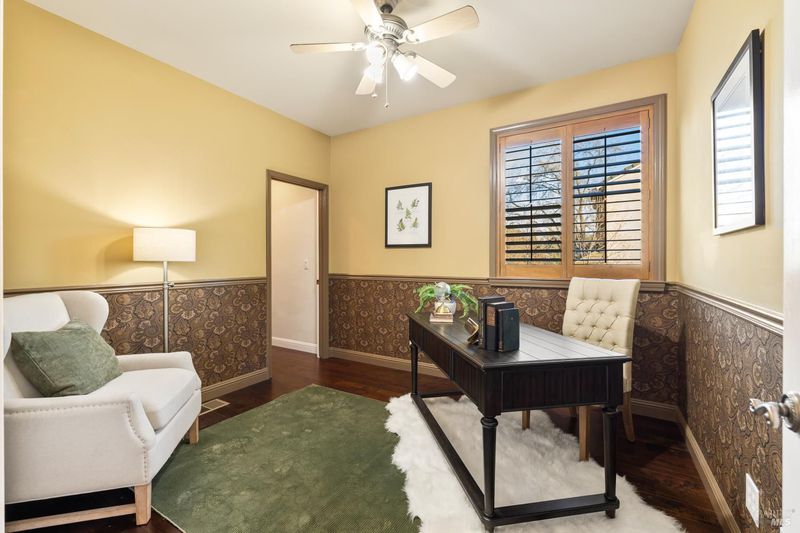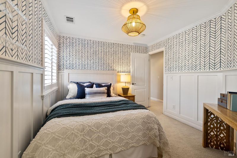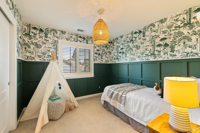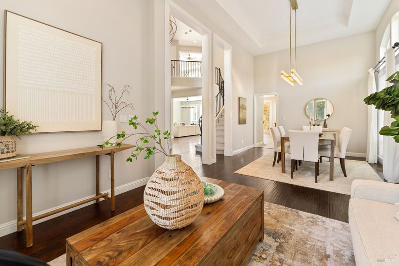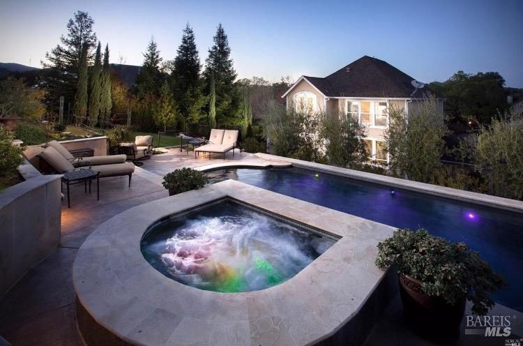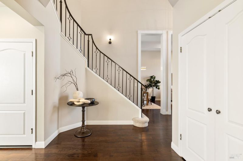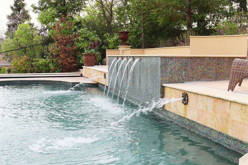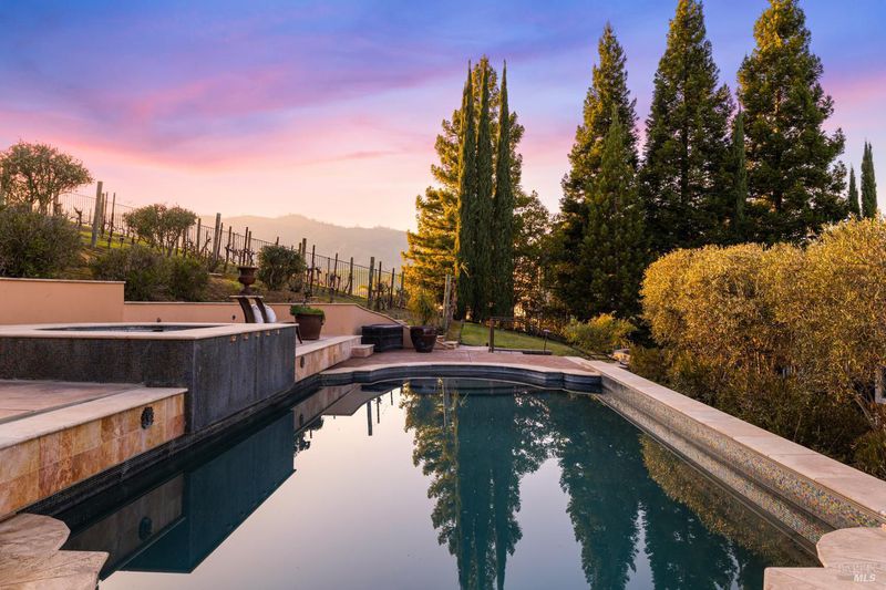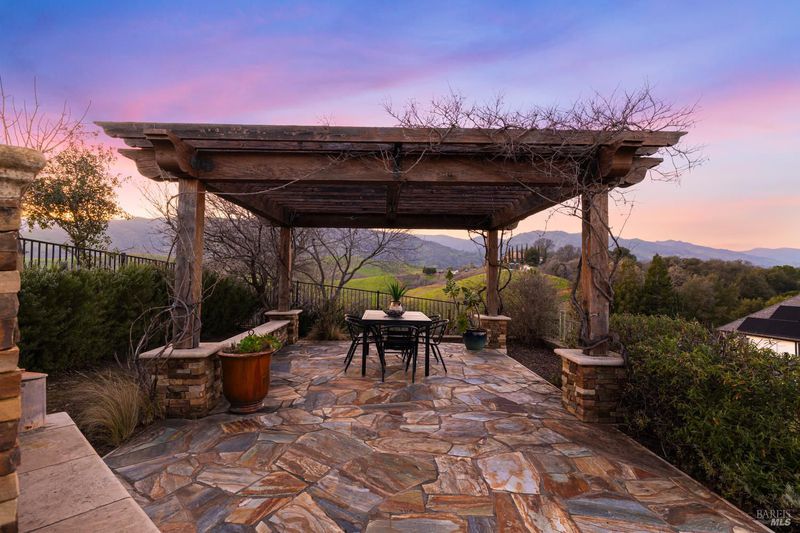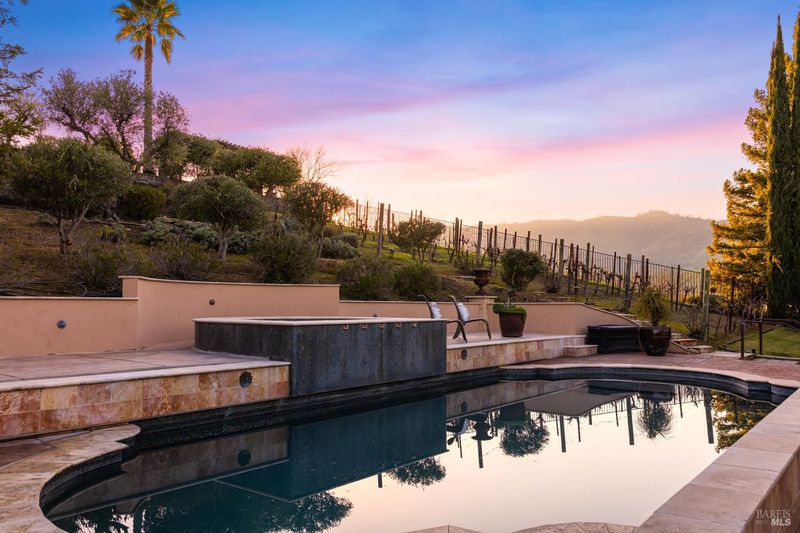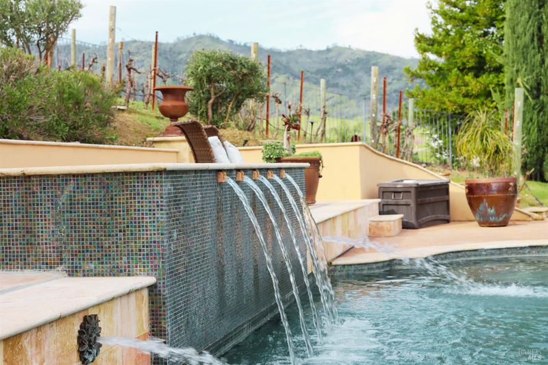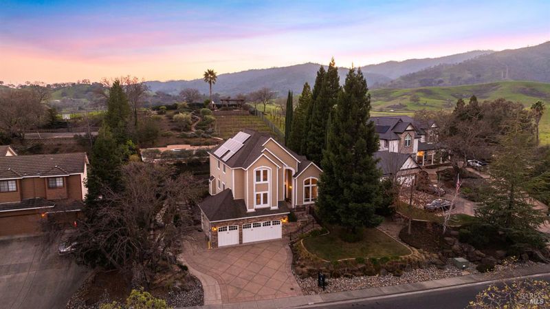 Located in a private court in North Vacaville's sought after Hidden Valley Estates and set on over half an acre, this extraordinary 6-bedroom residence with an optional den and owned solar blends refined luxury with breathtaking countryside views. A resort caliber backyard showcases a stunning built-in Gunite pool with motorized retractable cover, solar heat, LED lighting, water features, Baja shelf with umbrella insert, and an elevated attached 8-person built-in spa, all framed by stone retaining walls and steps, olive trees, lush landscaping, a custom flagstone patio with cedar pergola, travertine porch, and incredible custom iron fencing and gates. A spectacular irrigated hillside vineyard produces Zinfandel with past production of one barrel per year (350 bottles). Hilltop, a second custom pergola over a spacious patio and fireplace captures incredible panoramic views. Inside, no expense is spared with RH lighting, fixtures, mirrors, vanities, custom millwork, rich wallpaper and paint, hardwood flooring, ceiling fans, and plantation shutters. The grand formal entry showcases a spectacular chandelier, staircase with iron stair railing, sconces and expansive windows. The living and dining rooms are highlighted by a grand tray ceiling accented with recessed lighting and an elegant chandelier. The main level features 2 bedrooms, and a full bath perfect for guests or multigenerational living, and a large laundry room with quartz counters, sink and cabinetry. The stunning family room has a gas fireplace and is alongside the breakfast area that offers backyard access through newly installed Anderson French double doors. The kitchen features top of the line stainless-steel appliances including a gas range with hood and dishwasher, granite counters, high-end cabinetry, a custom wine rack with Subzero wine fridge, and a pantry closet. Upstairs, the primary suite has double doors, a tray ceiling, and large windows leading to a luxurious ensuite bathroom with a dual sink granite vanity, jetted tub positioned to capture vineyard views, a rain shower and oversized walk-in closet. 3 additional bedrooms and a full bath with double sinks complete the upper level. An interior staircase leads to the spacious 3-car garage with cabinetry, workbench and storage room, and the home also has a newly installed instant hot water heater. This rare and exceptional North Vacaville estate offers privacy and resort living all in one.