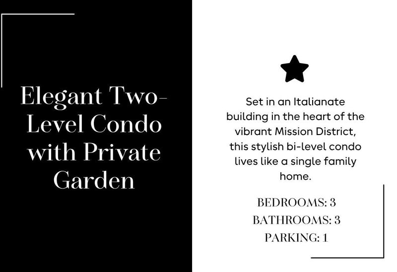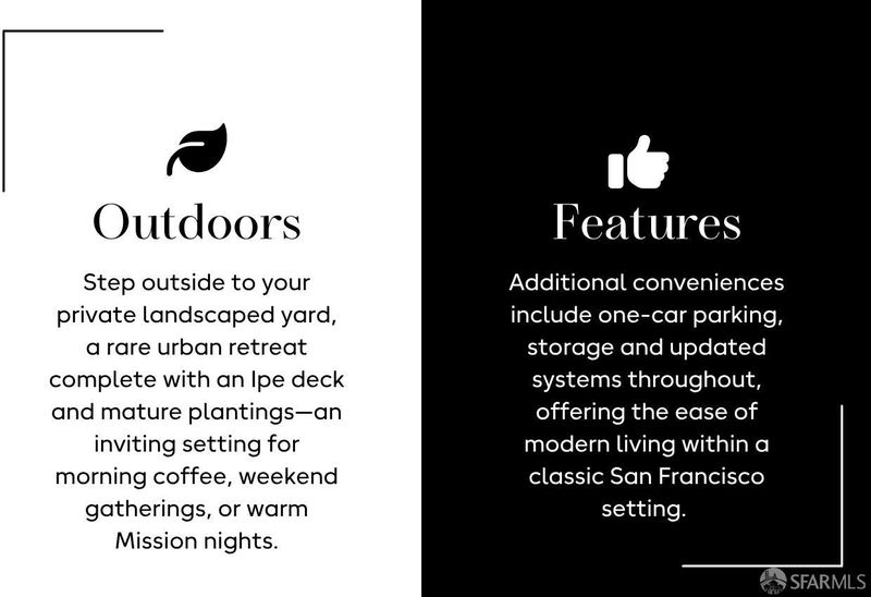 Set in an Italianate building in the heart of the vibrant Mission District, this stylish bi-level condo lives like a single family home, and blends timeless architectural detail with fresh, modern updates and a rare private yard. Soaring ceilings and generous proportions create an airy, light-filled atmosphere, while thoughtful renovations bring contemporary comfort to every space.The flexible layout offers three bedrooms, two ensuite, plus additional bath across two levels, providing ideal separation for guests, work-from-home living, or growing households. Primary bedroom also features a walk-in closet, and private deck. The updated kitchen features classic stone countertops, large pantry and ample workspace, connecting seamlessly to the main living and dining areasperfect for everyday living and effortless entertaining. Step outside to your private landscaped yard, a rare urban retreat complete with an Ipe deck and mature plantingsan inviting setting for morning coffee, weekend gatherings, or warm Mission nights. Additional conveniences include one-car parking, storage and updated systems throughout, offering the ease of modern living within a classic San Francisco setting. All just steps from the neighborhood's beloved cafs, acclaimed restaurants and shops, making the Mission District one of the city's most dynamic and sought-after places to call home.