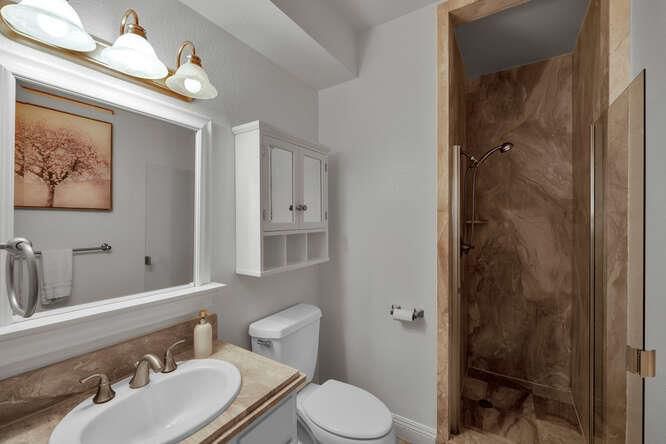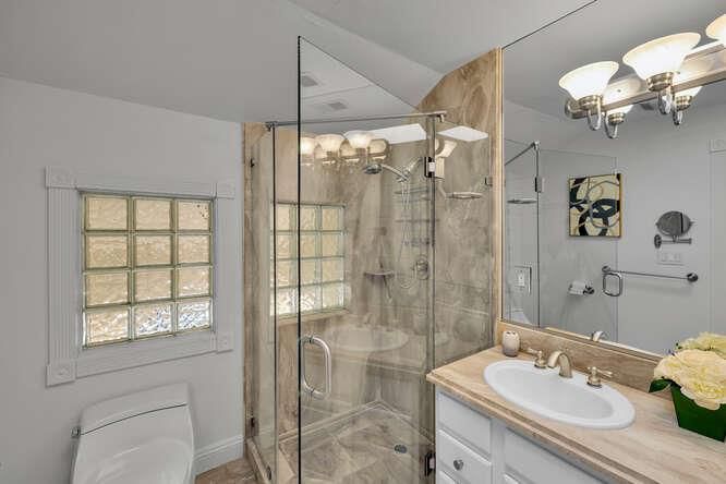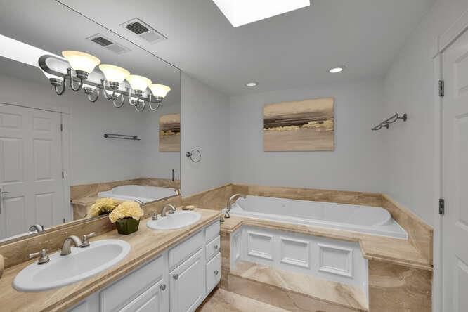 - Double Sinks, Full on Ground Floor, Granite, Primary - Stall Shower(s), Primary - Tub with Jets, Shower and Tub, Shower over Tub - 1, Skylight, Stall Shower - 2+, Stone