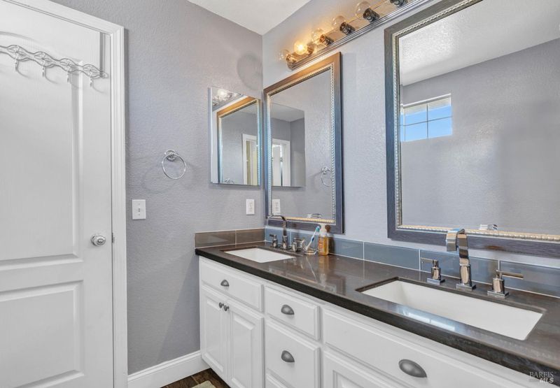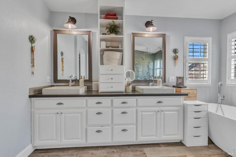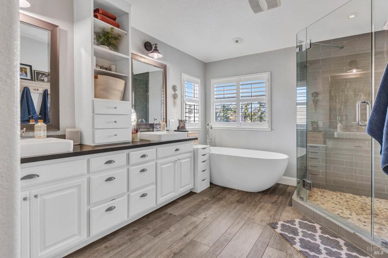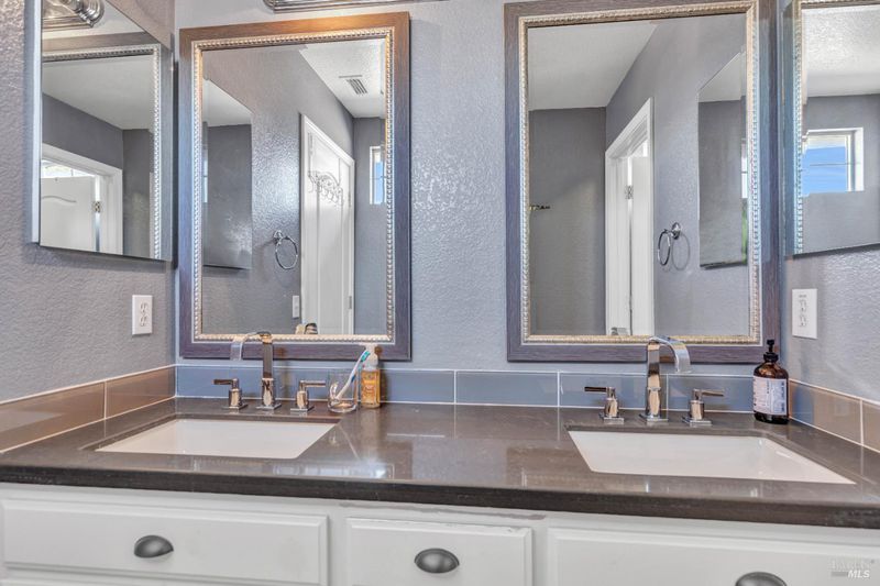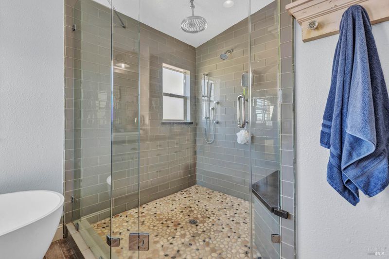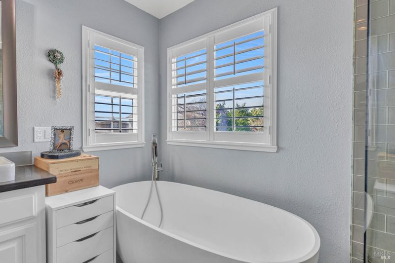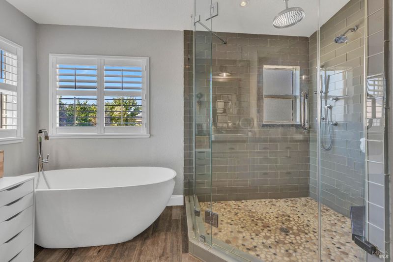 - Double Sinks, Multiple Shower Heads, Shower Stall(s), Soaking Tub, Tile, Window